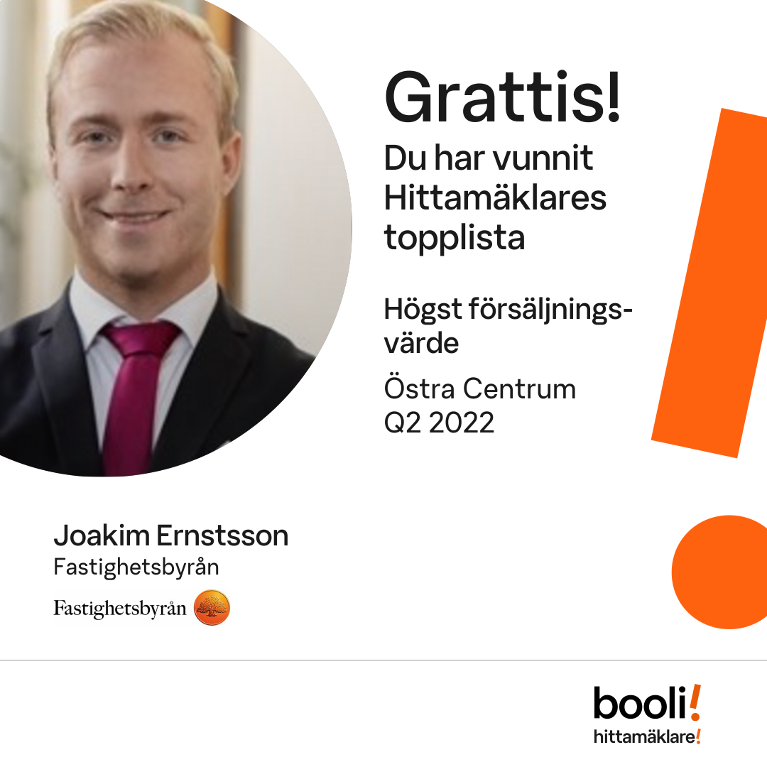 Statistik för publicerade bostäder, försäljningar och omdömen baseras på data från Booli och Hittamäklare. Statistiken för försäljningar avser inrapporterade och verifierade slutpriser från mäklare eller av Booli inhämtade och verifierade slutpriser. Statistiken för publicerade bostäder baseras på information som publicerats på Booli.se. Statistik för omdömen och rekommendationer baseras på omdömen från säljare som lämnats via Booli och Hittamäklare.