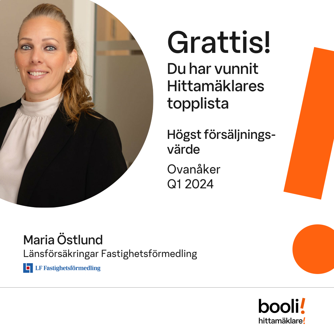 Statistik för publicerade bostäder, försäljningar och omdömen baseras på data från Booli och Hittamäklare. Statistiken för försäljningar avser inrapporterade och verifierade slutpriser från mäklare eller av Booli inhämtade och verifierade slutpriser. Statistiken för publicerade bostäder baseras på information som publicerats på Booli.se. Statistik för omdömen och rekommendationer baseras på omdömen från säljare som lämnats via Booli och Hittamäklare.
