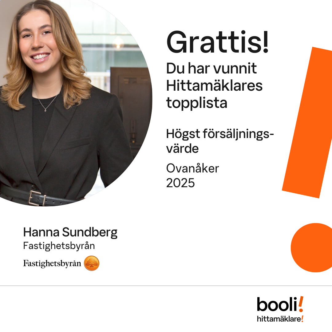 Statistik för publicerade bostäder, försäljningar och omdömen baseras på data från Booli och Hittamäklare. Statistiken för försäljningar avser inrapporterade och verifierade slutpriser från mäklare eller av Booli inhämtade och verifierade slutpriser. Statistiken för publicerade bostäder baseras på information som publicerats på Booli.se. Statistik för omdömen och rekommendationer baseras på omdömen från säljare som lämnats via Booli och Hittamäklare.