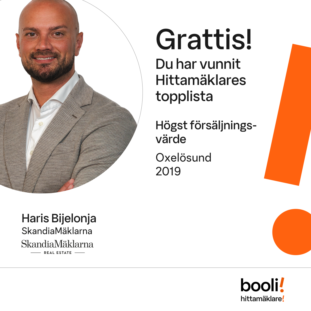 Statistik för publicerade bostäder, försäljningar och omdömen baseras på data från Booli och Hittamäklare. Statistiken för försäljningar avser inrapporterade och verifierade slutpriser från mäklare eller av Booli inhämtade och verifierade slutpriser. Statistiken för publicerade bostäder baseras på information som publicerats på Booli.se. Statistik för omdömen och rekommendationer baseras på omdömen från säljare som lämnats via Booli och Hittamäklare.