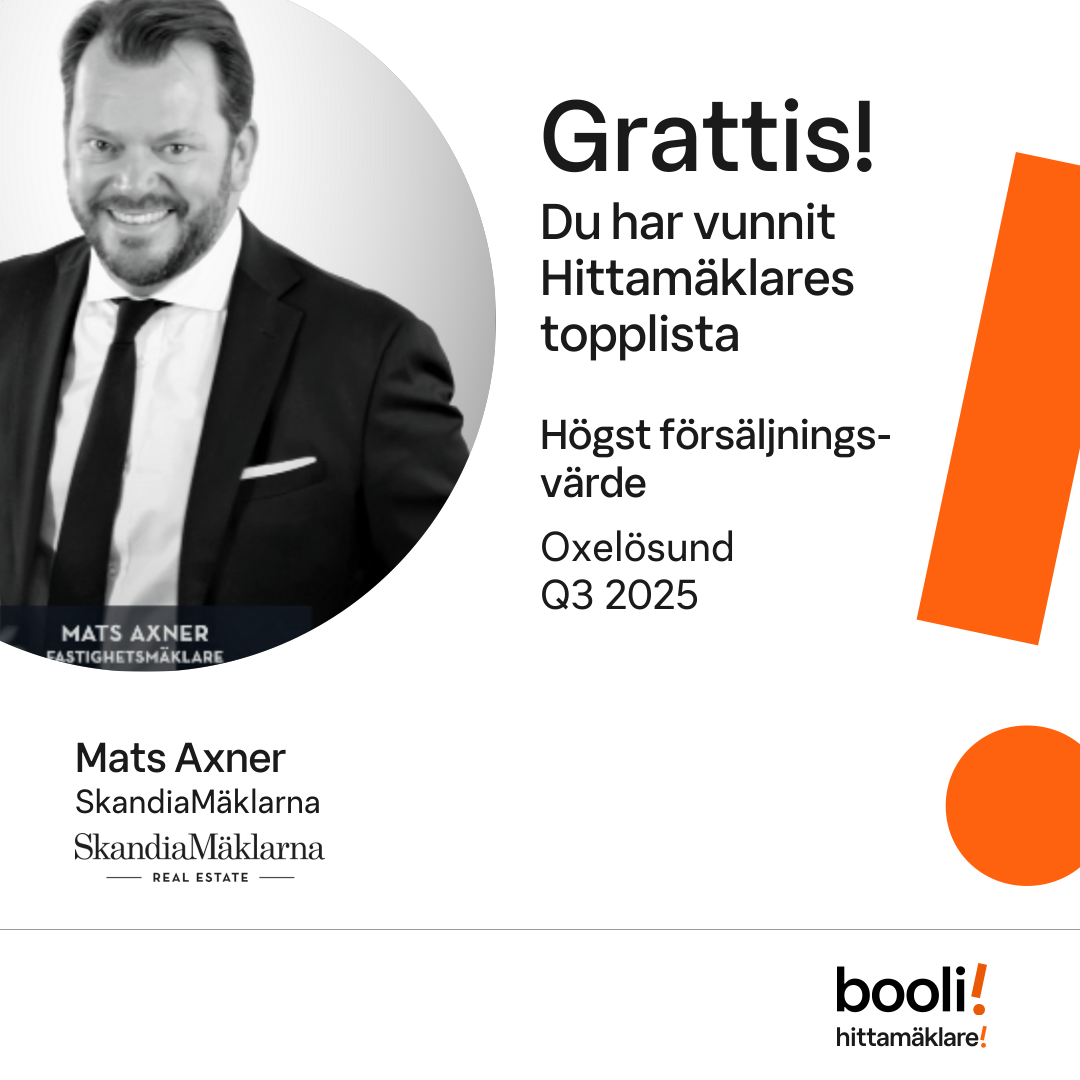 Statistik för publicerade bostäder, försäljningar och omdömen baseras på data från Booli och Hittamäklare. Statistiken för försäljningar avser inrapporterade och verifierade slutpriser från mäklare eller av Booli inhämtade och verifierade slutpriser. Statistiken för publicerade bostäder baseras på information som publicerats på Booli.se. Statistik för omdömen och rekommendationer baseras på omdömen från säljare som lämnats via Booli och Hittamäklare.