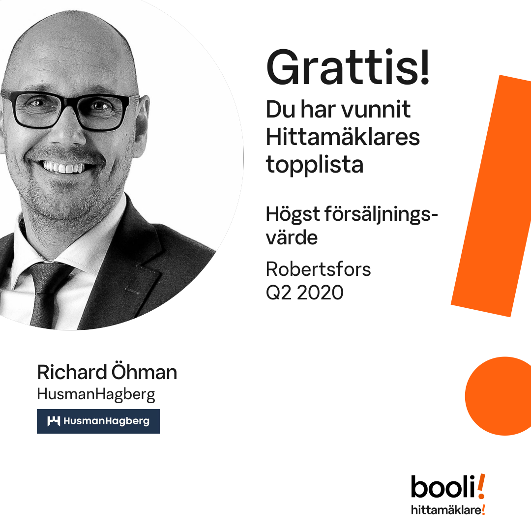 Statistik för publicerade bostäder, försäljningar och omdömen baseras på data från Booli och Hittamäklare. Statistiken för försäljningar avser inrapporterade och verifierade slutpriser från mäklare eller av Booli inhämtade och verifierade slutpriser. Statistiken för publicerade bostäder baseras på information som publicerats på Booli.se. Statistik för omdömen och rekommendationer baseras på omdömen från säljare som lämnats via Booli och Hittamäklare.