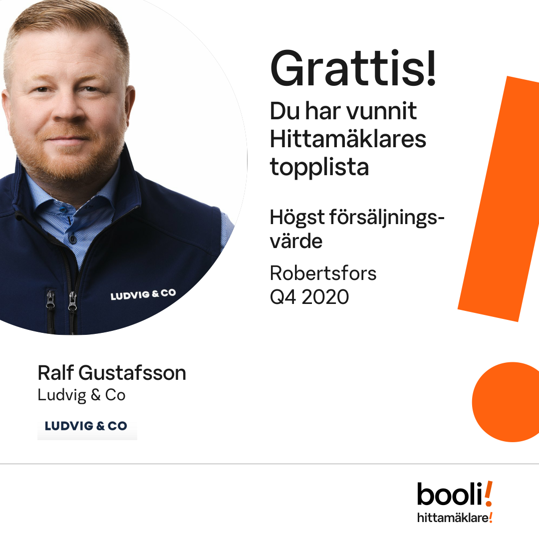 Statistik för publicerade bostäder, försäljningar och omdömen baseras på data från Booli och Hittamäklare. Statistiken för försäljningar avser inrapporterade och verifierade slutpriser från mäklare eller av Booli inhämtade och verifierade slutpriser. Statistiken för publicerade bostäder baseras på information som publicerats på Booli.se. Statistik för omdömen och rekommendationer baseras på omdömen från säljare som lämnats via Booli och Hittamäklare.