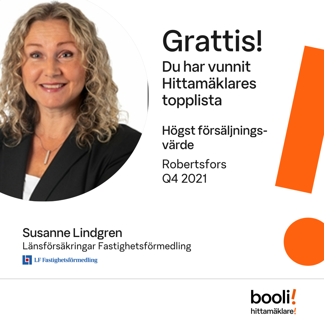 Statistik för publicerade bostäder, försäljningar och omdömen baseras på data från Booli och Hittamäklare. Statistiken för försäljningar avser inrapporterade och verifierade slutpriser från mäklare eller av Booli inhämtade och verifierade slutpriser. Statistiken för publicerade bostäder baseras på information som publicerats på Booli.se. Statistik för omdömen och rekommendationer baseras på omdömen från säljare som lämnats via Booli och Hittamäklare.