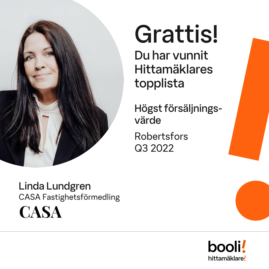 Statistik för publicerade bostäder, försäljningar och omdömen baseras på data från Booli och Hittamäklare. Statistiken för försäljningar avser inrapporterade och verifierade slutpriser från mäklare eller av Booli inhämtade och verifierade slutpriser. Statistiken för publicerade bostäder baseras på information som publicerats på Booli.se. Statistik för omdömen och rekommendationer baseras på omdömen från säljare som lämnats via Booli och Hittamäklare.