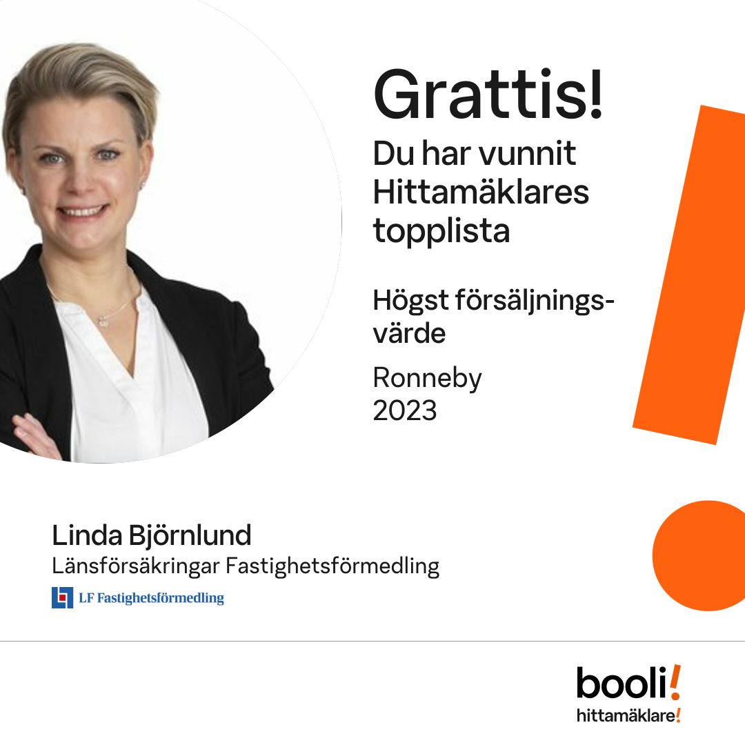 Statistik för publicerade bostäder, försäljningar och omdömen baseras på data från Booli och Hittamäklare. Statistiken för försäljningar avser inrapporterade och verifierade slutpriser från mäklare eller av Booli inhämtade och verifierade slutpriser. Statistiken för publicerade bostäder baseras på information som publicerats på Booli.se. Statistik för omdömen och rekommendationer baseras på omdömen från säljare som lämnats via Booli och Hittamäklare.