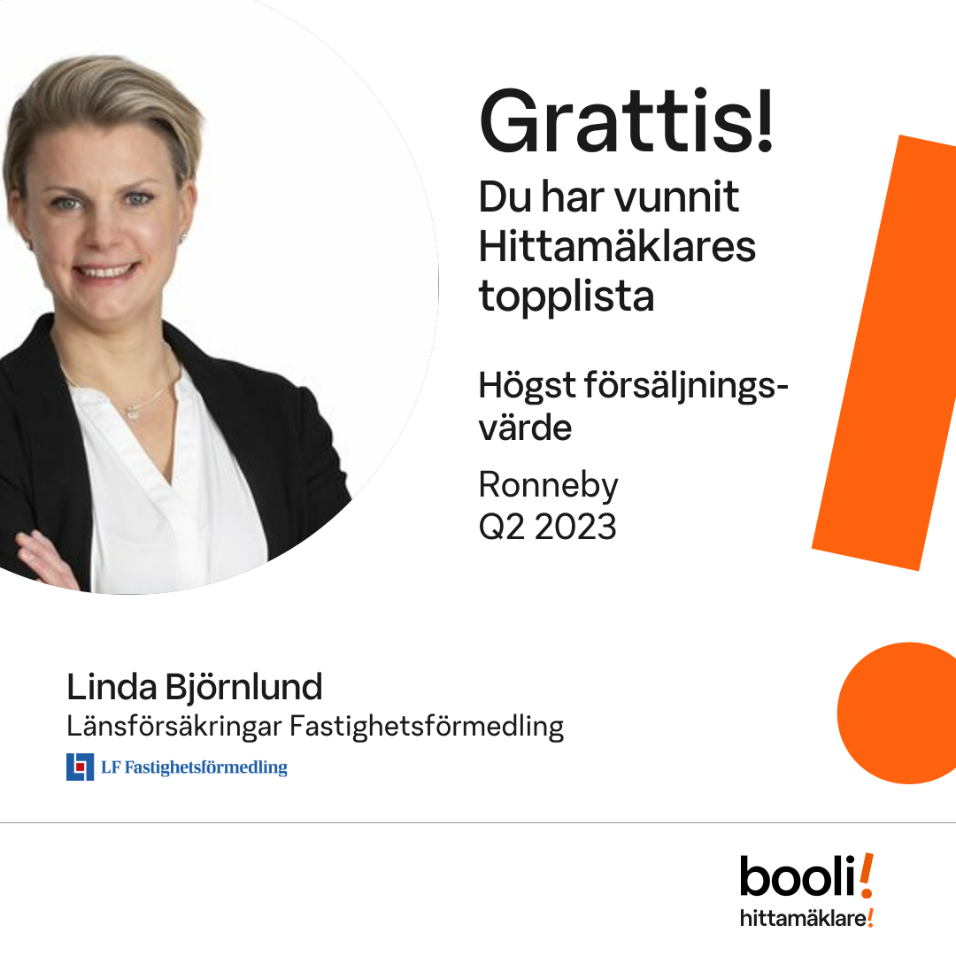 Statistik för publicerade bostäder, försäljningar och omdömen baseras på data från Booli och Hittamäklare. Statistiken för försäljningar avser inrapporterade och verifierade slutpriser från mäklare eller av Booli inhämtade och verifierade slutpriser. Statistiken för publicerade bostäder baseras på information som publicerats på Booli.se. Statistik för omdömen och rekommendationer baseras på omdömen från säljare som lämnats via Booli och Hittamäklare.