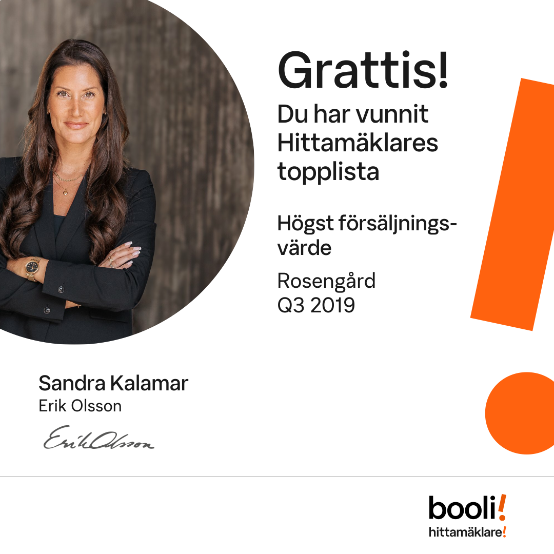 Statistik för publicerade bostäder, försäljningar och omdömen baseras på data från Booli och Hittamäklare. Statistiken för försäljningar avser inrapporterade och verifierade slutpriser från mäklare eller av Booli inhämtade och verifierade slutpriser. Statistiken för publicerade bostäder baseras på information som publicerats på Booli.se. Statistik för omdömen och rekommendationer baseras på omdömen från säljare som lämnats via Booli och Hittamäklare.