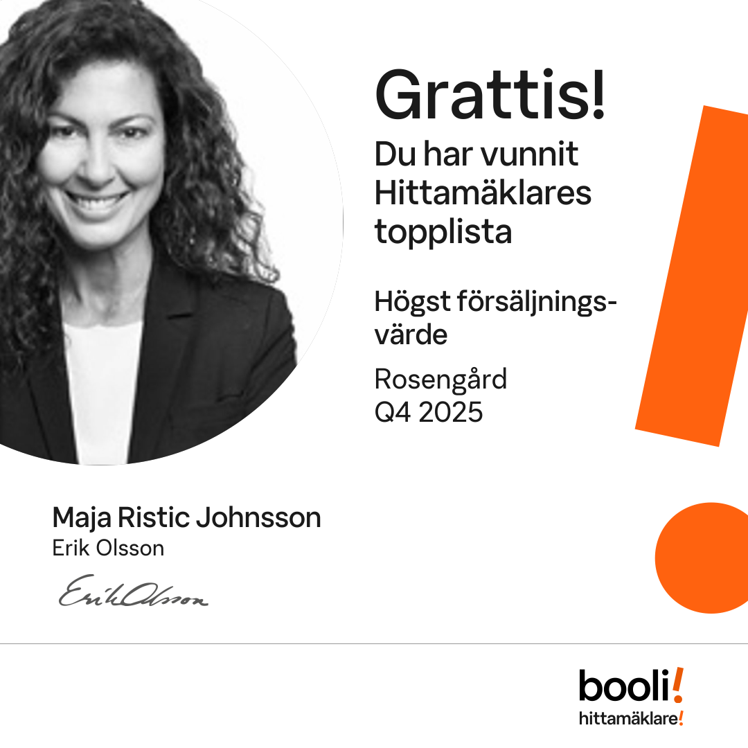 Statistik för publicerade bostäder, försäljningar och omdömen baseras på data från Booli och Hittamäklare. Statistiken för försäljningar avser inrapporterade och verifierade slutpriser från mäklare eller av Booli inhämtade och verifierade slutpriser. Statistiken för publicerade bostäder baseras på information som publicerats på Booli.se. Statistik för omdömen och rekommendationer baseras på omdömen från säljare som lämnats via Booli och Hittamäklare.