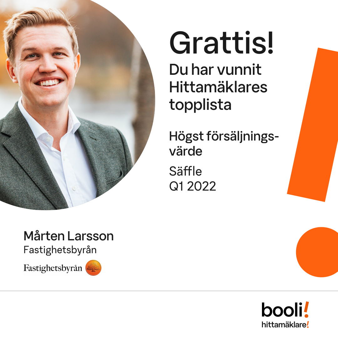 Statistik för publicerade bostäder, försäljningar och omdömen baseras på data från Booli och Hittamäklare. Statistiken för försäljningar avser inrapporterade och verifierade slutpriser från mäklare eller av Booli inhämtade och verifierade slutpriser. Statistiken för publicerade bostäder baseras på information som publicerats på Booli.se. Statistik för omdömen och rekommendationer baseras på omdömen från säljare som lämnats via Booli och Hittamäklare.