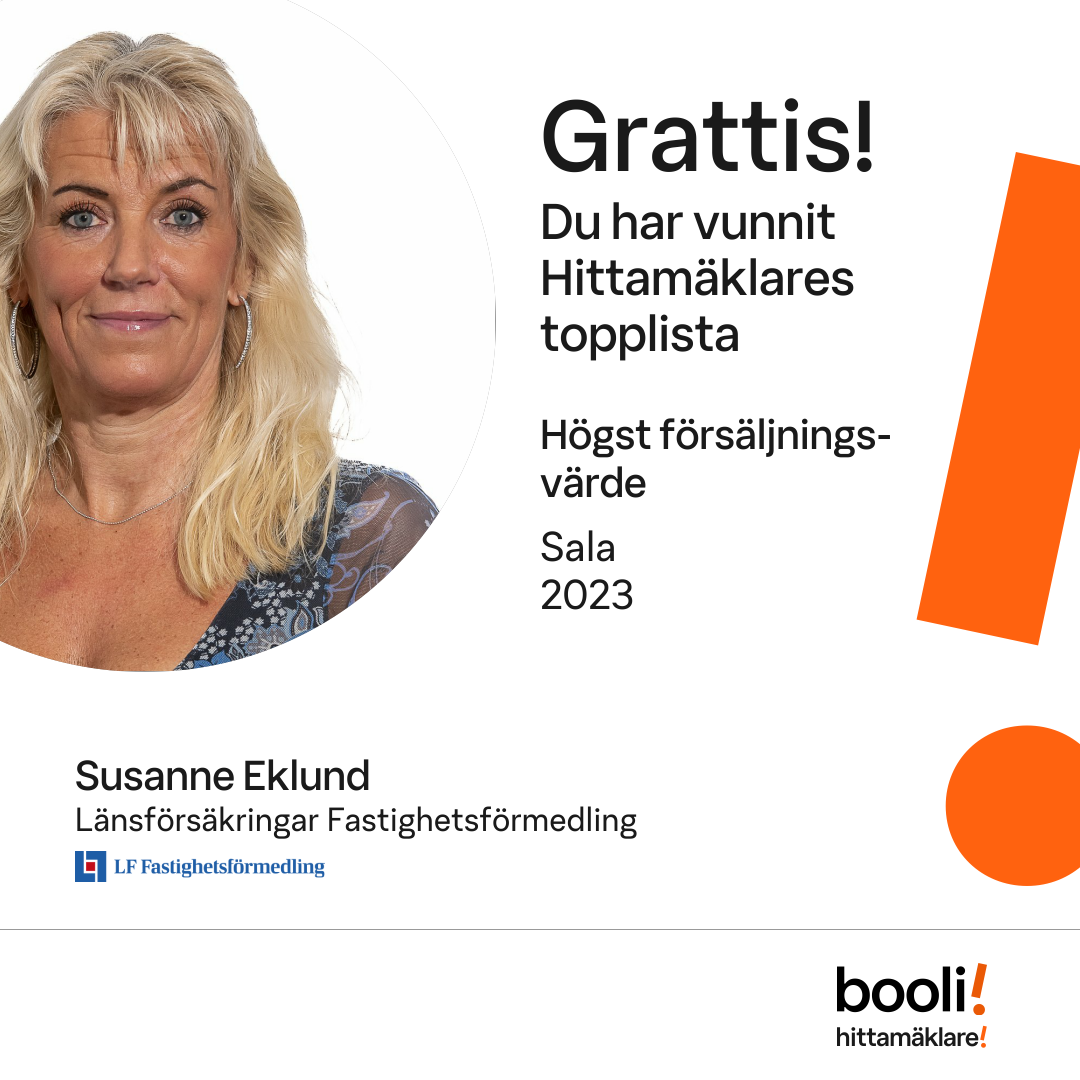 Statistik för publicerade bostäder, försäljningar och omdömen baseras på data från Booli och Hittamäklare. Statistiken för försäljningar avser inrapporterade och verifierade slutpriser från mäklare eller av Booli inhämtade och verifierade slutpriser. Statistiken för publicerade bostäder baseras på information som publicerats på Booli.se. Statistik för omdömen och rekommendationer baseras på omdömen från säljare som lämnats via Booli och Hittamäklare.