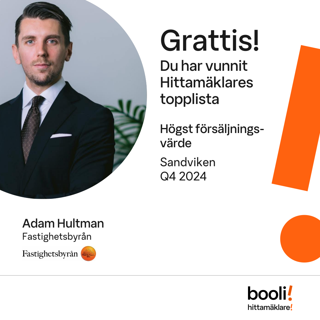 Statistik för publicerade bostäder, försäljningar och omdömen baseras på data från Booli och Hittamäklare. Statistiken för försäljningar avser inrapporterade och verifierade slutpriser från mäklare eller av Booli inhämtade och verifierade slutpriser. Statistiken för publicerade bostäder baseras på information som publicerats på Booli.se. Statistik för omdömen och rekommendationer baseras på omdömen från säljare som lämnats via Booli och Hittamäklare.