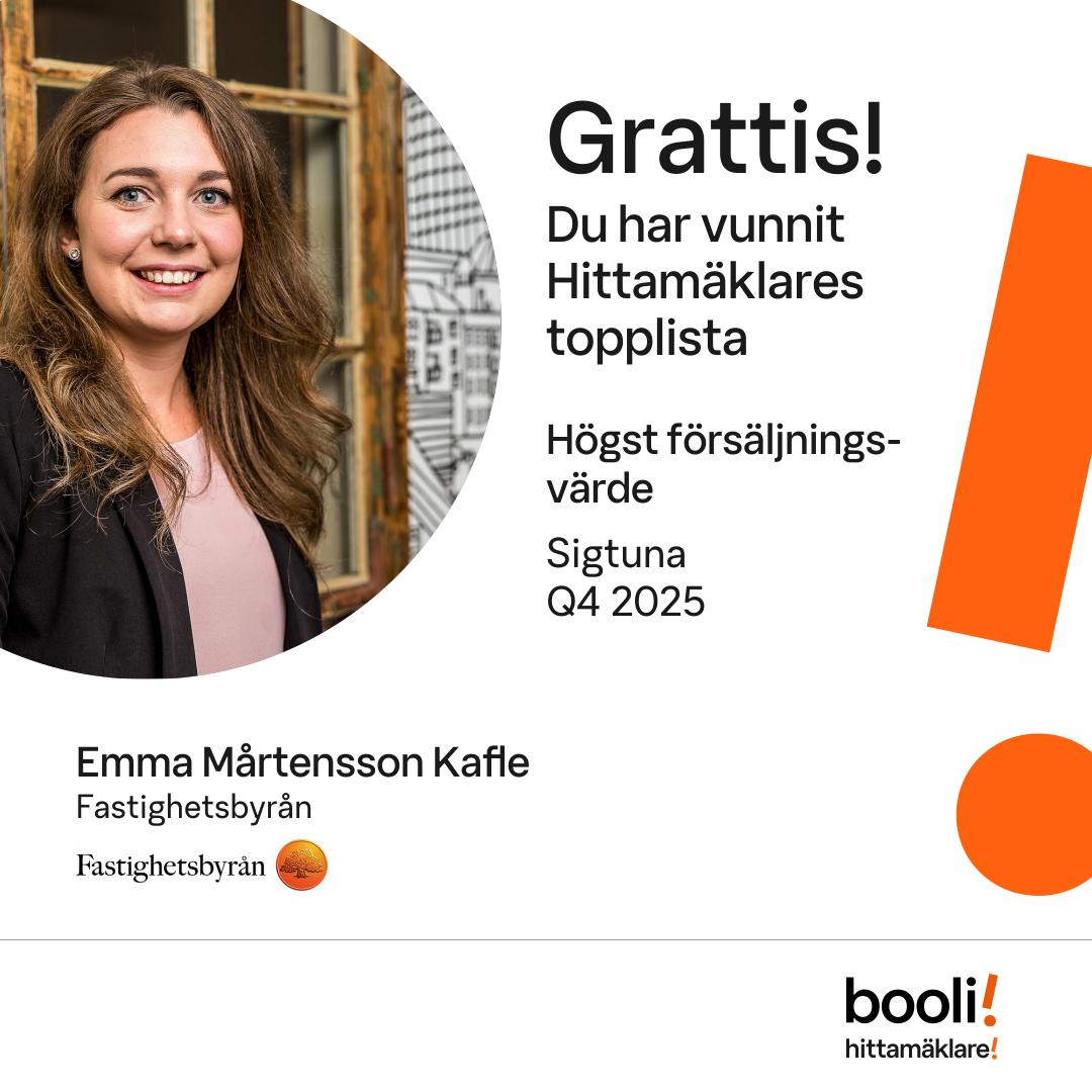 Statistik för publicerade bostäder, försäljningar och omdömen baseras på data från Booli och Hittamäklare. Statistiken för försäljningar avser inrapporterade och verifierade slutpriser från mäklare eller av Booli inhämtade och verifierade slutpriser. Statistiken för publicerade bostäder baseras på information som publicerats på Booli.se. Statistik för omdömen och rekommendationer baseras på omdömen från säljare som lämnats via Booli och Hittamäklare.