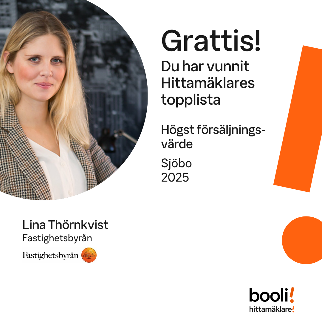 Statistik för publicerade bostäder, försäljningar och omdömen baseras på data från Booli och Hittamäklare. Statistiken för försäljningar avser inrapporterade och verifierade slutpriser från mäklare eller av Booli inhämtade och verifierade slutpriser. Statistiken för publicerade bostäder baseras på information som publicerats på Booli.se. Statistik för omdömen och rekommendationer baseras på omdömen från säljare som lämnats via Booli och Hittamäklare.