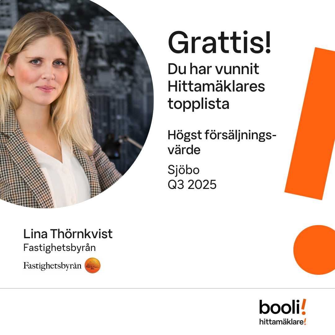 Statistik för publicerade bostäder, försäljningar och omdömen baseras på data från Booli och Hittamäklare. Statistiken för försäljningar avser inrapporterade och verifierade slutpriser från mäklare eller av Booli inhämtade och verifierade slutpriser. Statistiken för publicerade bostäder baseras på information som publicerats på Booli.se. Statistik för omdömen och rekommendationer baseras på omdömen från säljare som lämnats via Booli och Hittamäklare.