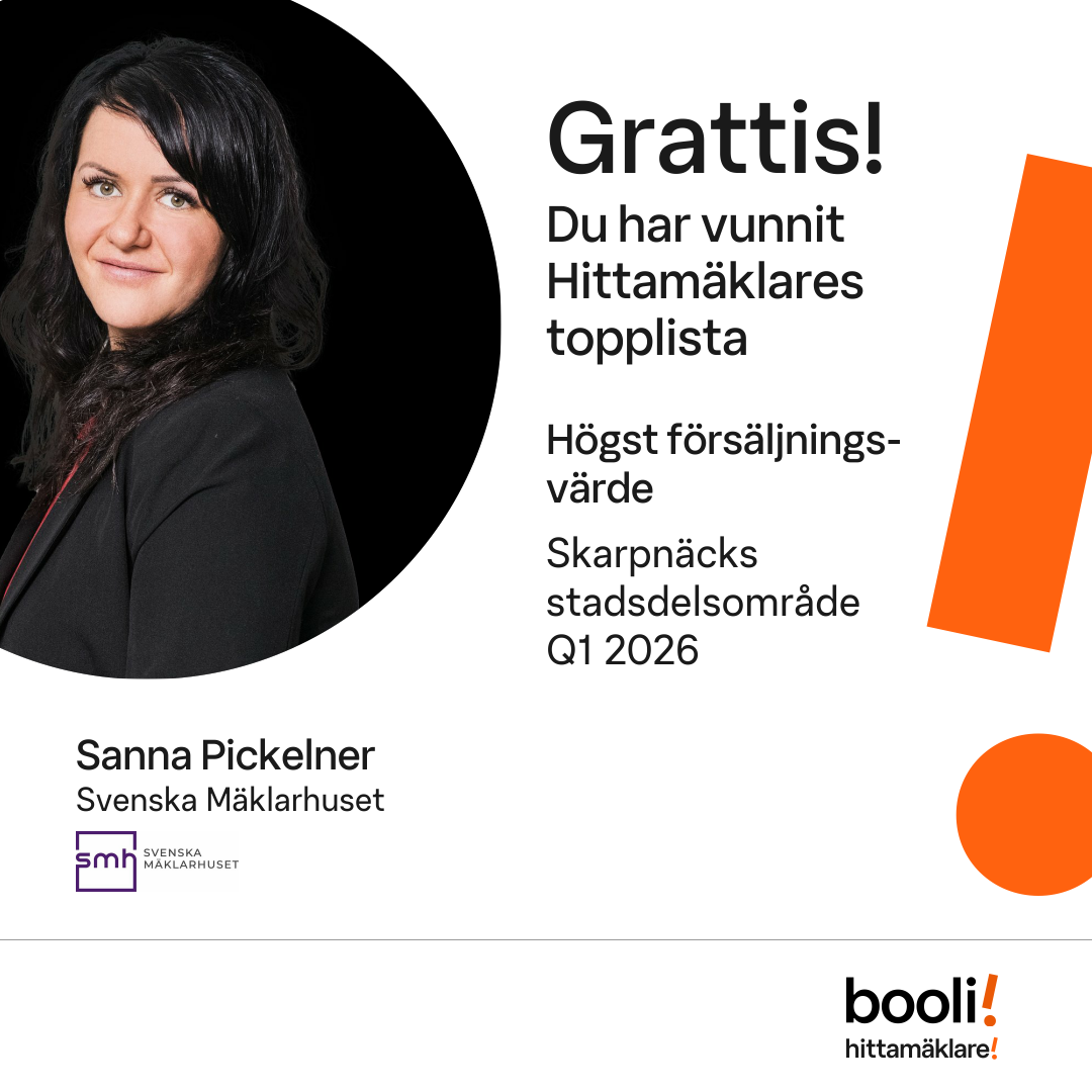 Statistik för publicerade bostäder, försäljningar och omdömen baseras på data från Booli och Hittamäklare. Statistiken för försäljningar avser inrapporterade och verifierade slutpriser från mäklare eller av Booli inhämtade och verifierade slutpriser. Statistiken för publicerade bostäder baseras på information som publicerats på Booli.se. Statistik för omdömen och rekommendationer baseras på omdömen från säljare som lämnats via Booli och Hittamäklare.