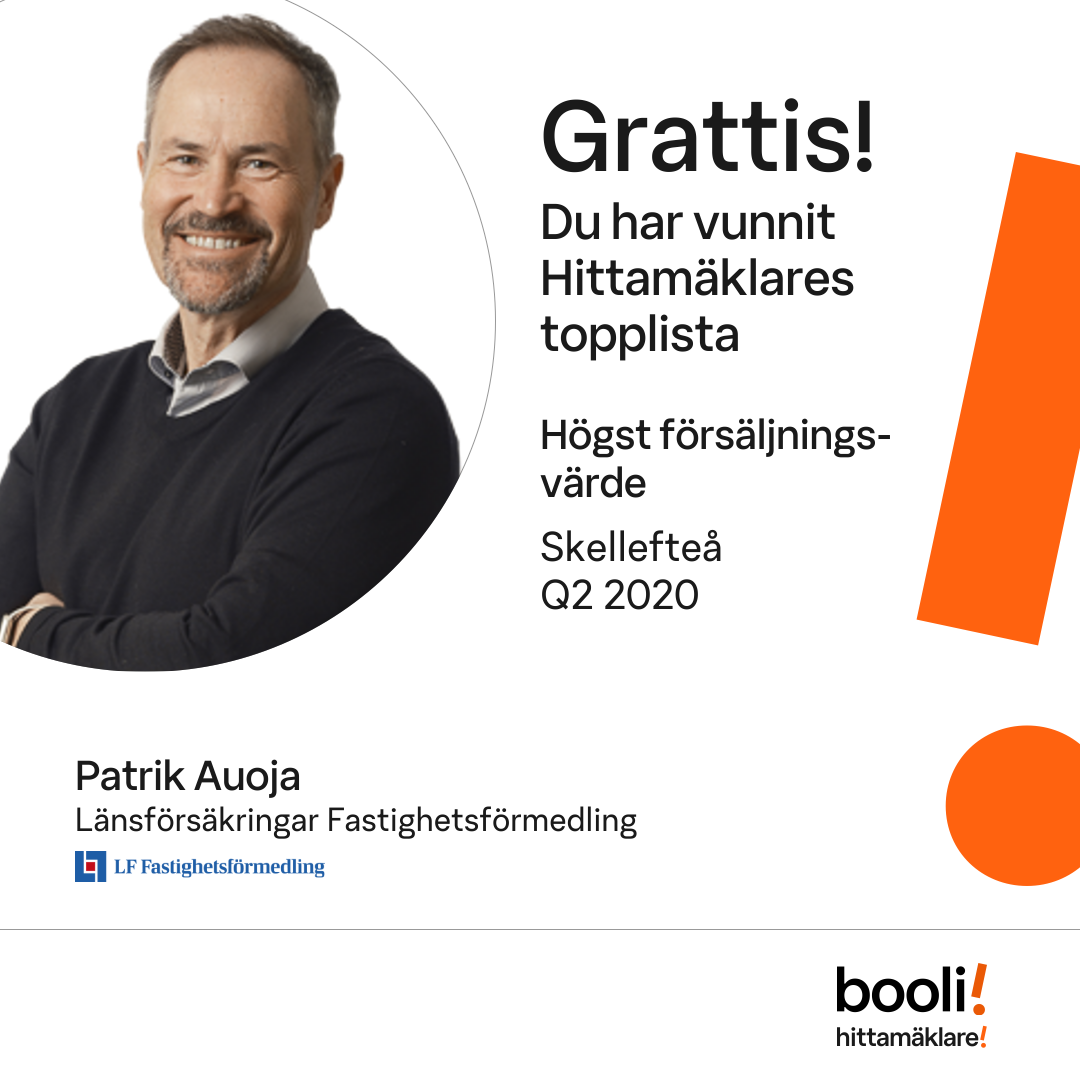 Statistik för publicerade bostäder, försäljningar och omdömen baseras på data från Booli och Hittamäklare. Statistiken för försäljningar avser inrapporterade och verifierade slutpriser från mäklare eller av Booli inhämtade och verifierade slutpriser. Statistiken för publicerade bostäder baseras på information som publicerats på Booli.se. Statistik för omdömen och rekommendationer baseras på omdömen från säljare som lämnats via Booli och Hittamäklare.