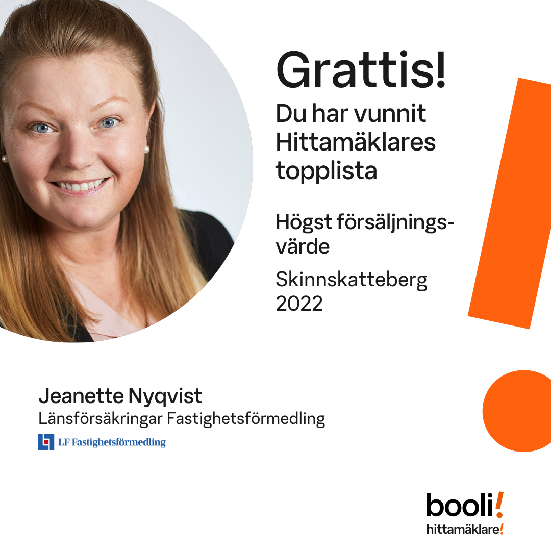 Statistik för publicerade bostäder, försäljningar och omdömen baseras på data från Booli och Hittamäklare. Statistiken för försäljningar avser inrapporterade och verifierade slutpriser från mäklare eller av Booli inhämtade och verifierade slutpriser. Statistiken för publicerade bostäder baseras på information som publicerats på Booli.se. Statistik för omdömen och rekommendationer baseras på omdömen från säljare som lämnats via Booli och Hittamäklare.