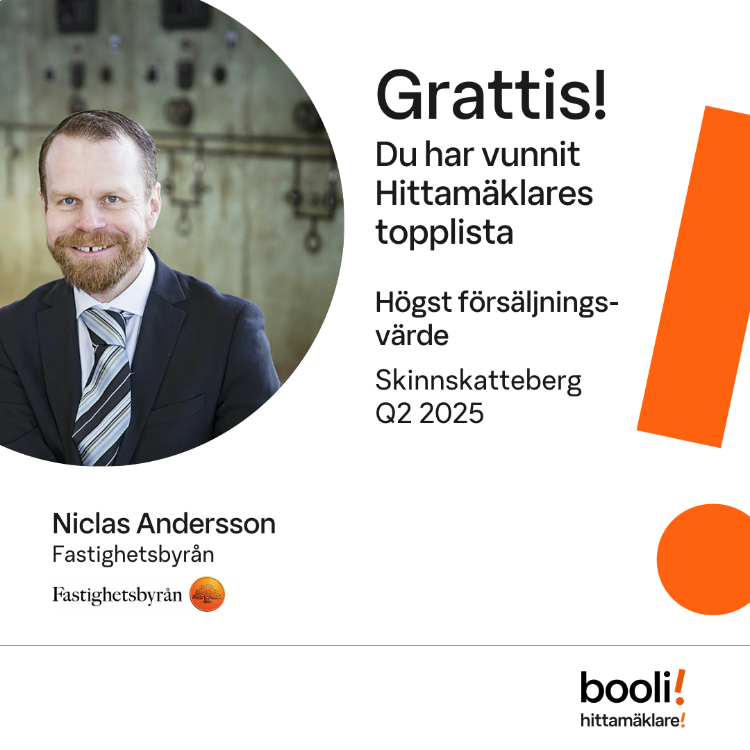 Statistik för publicerade bostäder, försäljningar och omdömen baseras på data från Booli och Hittamäklare. Statistiken för försäljningar avser inrapporterade och verifierade slutpriser från mäklare eller av Booli inhämtade och verifierade slutpriser. Statistiken för publicerade bostäder baseras på information som publicerats på Booli.se. Statistik för omdömen och rekommendationer baseras på omdömen från säljare som lämnats via Booli och Hittamäklare.