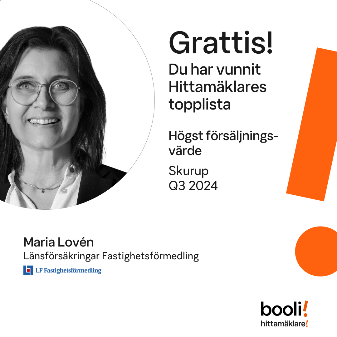 Statistik för publicerade bostäder, försäljningar och omdömen baseras på data från Booli och Hittamäklare. Statistiken för försäljningar avser inrapporterade och verifierade slutpriser från mäklare eller av Booli inhämtade och verifierade slutpriser. Statistiken för publicerade bostäder baseras på information som publicerats på Booli.se. Statistik för omdömen och rekommendationer baseras på omdömen från säljare som lämnats via Booli och Hittamäklare.