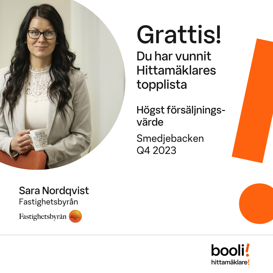 Statistik för publicerade bostäder, försäljningar och omdömen baseras på data från Booli och Hittamäklare. Statistiken för försäljningar avser inrapporterade och verifierade slutpriser från mäklare eller av Booli inhämtade och verifierade slutpriser. Statistiken för publicerade bostäder baseras på information som publicerats på Booli.se. Statistik för omdömen och rekommendationer baseras på omdömen från säljare som lämnats via Booli och Hittamäklare.