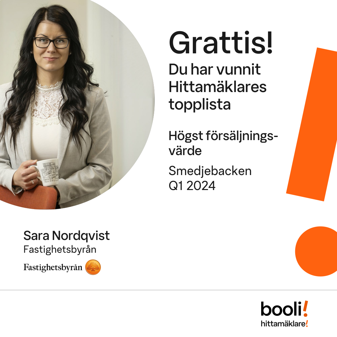 Statistik för publicerade bostäder, försäljningar och omdömen baseras på data från Booli och Hittamäklare. Statistiken för försäljningar avser inrapporterade och verifierade slutpriser från mäklare eller av Booli inhämtade och verifierade slutpriser. Statistiken för publicerade bostäder baseras på information som publicerats på Booli.se. Statistik för omdömen och rekommendationer baseras på omdömen från säljare som lämnats via Booli och Hittamäklare.