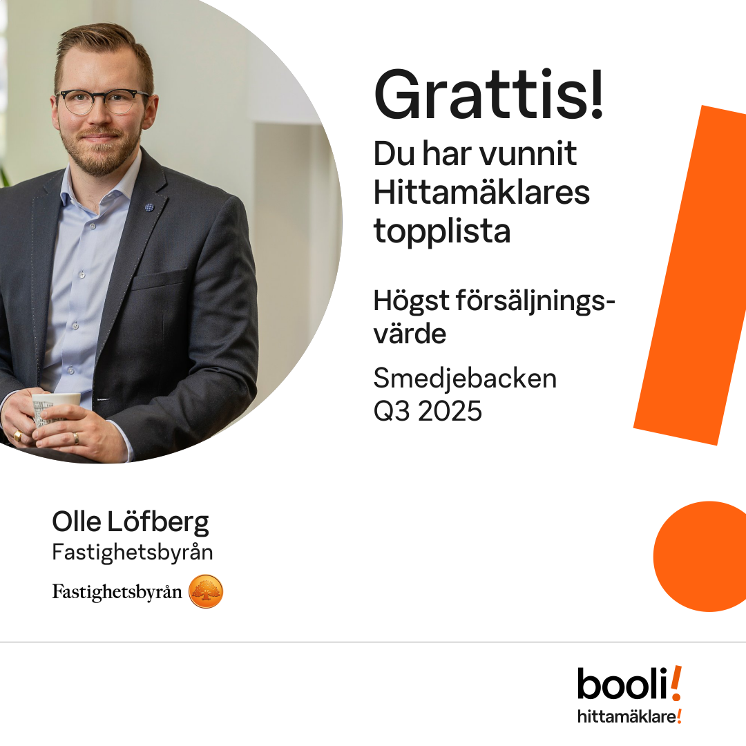 Statistik för publicerade bostäder, försäljningar och omdömen baseras på data från Booli och Hittamäklare. Statistiken för försäljningar avser inrapporterade och verifierade slutpriser från mäklare eller av Booli inhämtade och verifierade slutpriser. Statistiken för publicerade bostäder baseras på information som publicerats på Booli.se. Statistik för omdömen och rekommendationer baseras på omdömen från säljare som lämnats via Booli och Hittamäklare.