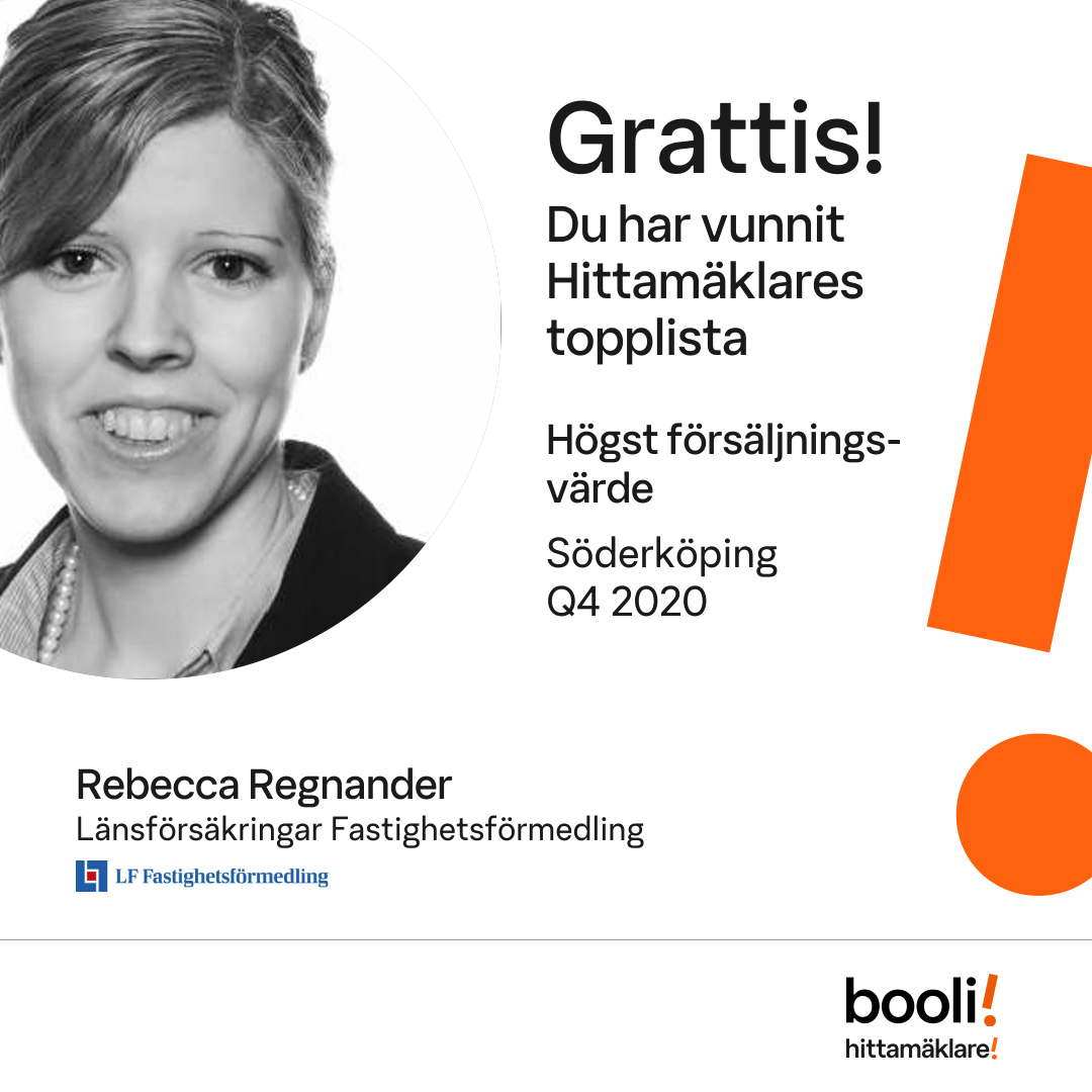 Statistik för publicerade bostäder, försäljningar och omdömen baseras på data från Booli och Hittamäklare. Statistiken för försäljningar avser inrapporterade och verifierade slutpriser från mäklare eller av Booli inhämtade och verifierade slutpriser. Statistiken för publicerade bostäder baseras på information som publicerats på Booli.se. Statistik för omdömen och rekommendationer baseras på omdömen från säljare som lämnats via Booli och Hittamäklare.