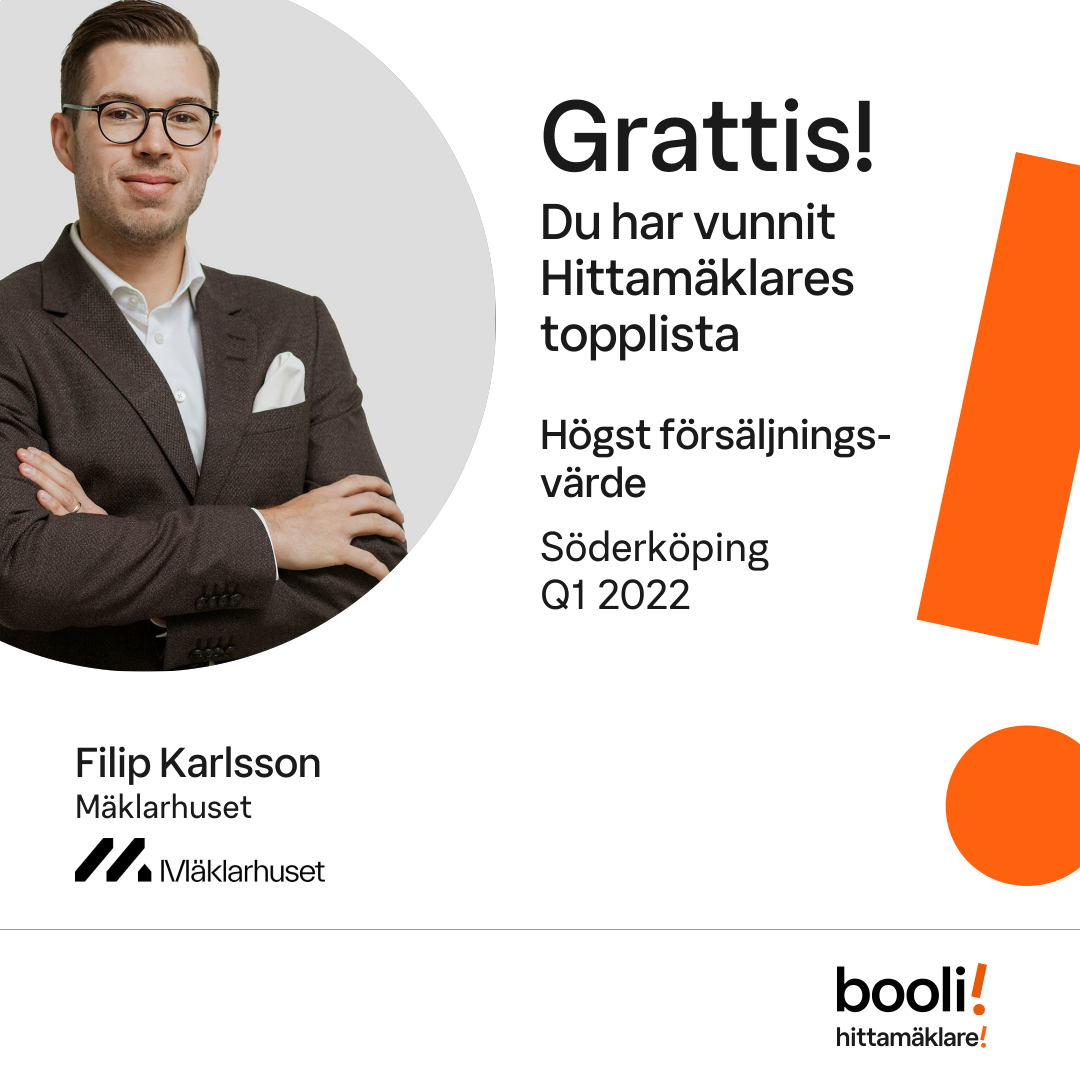 Statistik för publicerade bostäder, försäljningar och omdömen baseras på data från Booli och Hittamäklare. Statistiken för försäljningar avser inrapporterade och verifierade slutpriser från mäklare eller av Booli inhämtade och verifierade slutpriser. Statistiken för publicerade bostäder baseras på information som publicerats på Booli.se. Statistik för omdömen och rekommendationer baseras på omdömen från säljare som lämnats via Booli och Hittamäklare.