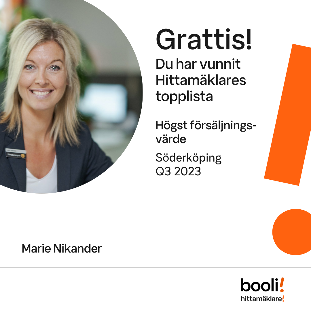 Statistik för publicerade bostäder, försäljningar och omdömen baseras på data från Booli och Hittamäklare. Statistiken för försäljningar avser inrapporterade och verifierade slutpriser från mäklare eller av Booli inhämtade och verifierade slutpriser. Statistiken för publicerade bostäder baseras på information som publicerats på Booli.se. Statistik för omdömen och rekommendationer baseras på omdömen från säljare som lämnats via Booli och Hittamäklare.