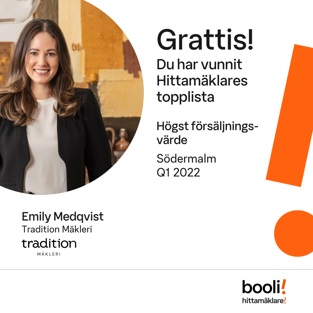 Statistik för publicerade bostäder, försäljningar och omdömen baseras på data från Booli och Hittamäklare. Statistiken för försäljningar avser inrapporterade och verifierade slutpriser från mäklare eller av Booli inhämtade och verifierade slutpriser. Statistiken för publicerade bostäder baseras på information som publicerats på Booli.se. Statistik för omdömen och rekommendationer baseras på omdömen från säljare som lämnats via Booli och Hittamäklare.