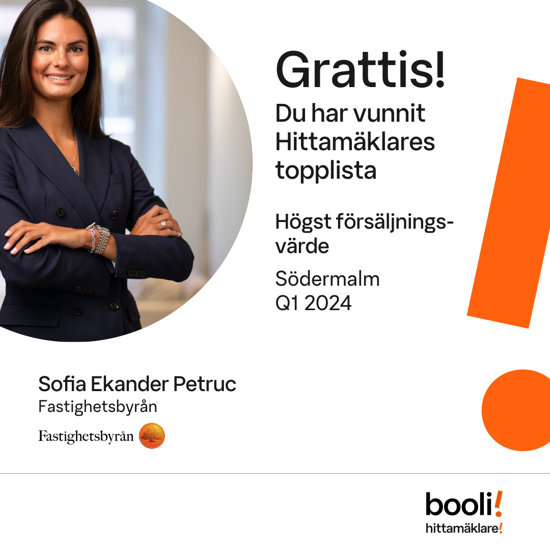Statistik för publicerade bostäder, försäljningar och omdömen baseras på data från Booli och Hittamäklare. Statistiken för försäljningar avser inrapporterade och verifierade slutpriser från mäklare eller av Booli inhämtade och verifierade slutpriser. Statistiken för publicerade bostäder baseras på information som publicerats på Booli.se. Statistik för omdömen och rekommendationer baseras på omdömen från säljare som lämnats via Booli och Hittamäklare.