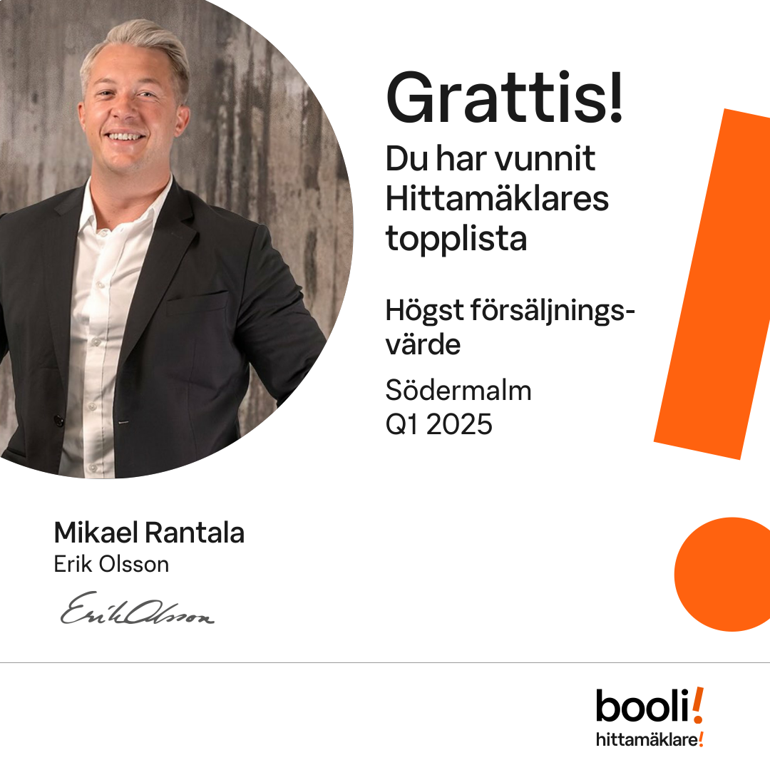 Statistik för publicerade bostäder, försäljningar och omdömen baseras på data från Booli och Hittamäklare. Statistiken för försäljningar avser inrapporterade och verifierade slutpriser från mäklare eller av Booli inhämtade och verifierade slutpriser. Statistiken för publicerade bostäder baseras på information som publicerats på Booli.se. Statistik för omdömen och rekommendationer baseras på omdömen från säljare som lämnats via Booli och Hittamäklare.