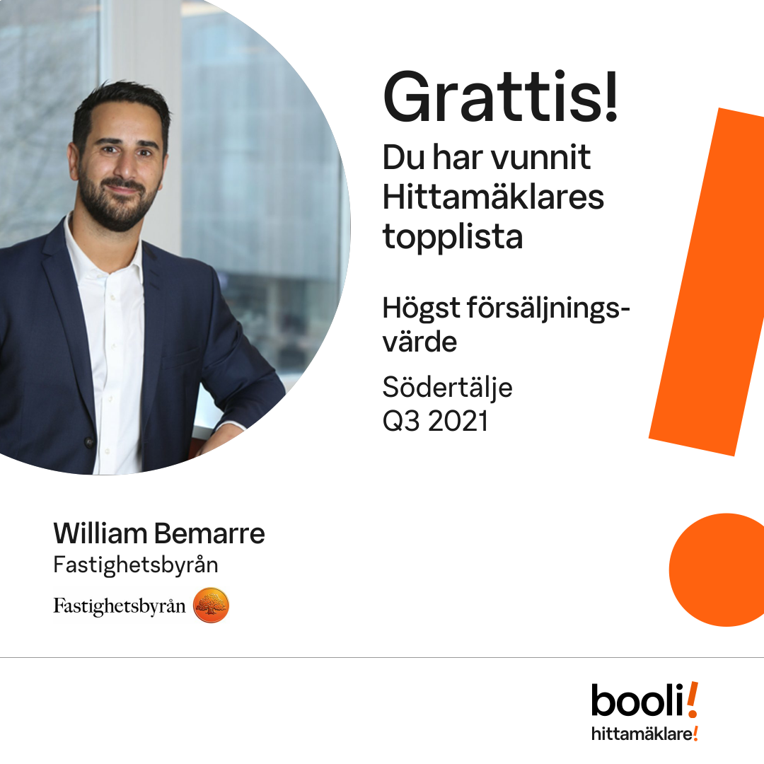 Statistik för publicerade bostäder, försäljningar och omdömen baseras på data från Booli och Hittamäklare. Statistiken för försäljningar avser inrapporterade och verifierade slutpriser från mäklare eller av Booli inhämtade och verifierade slutpriser. Statistiken för publicerade bostäder baseras på information som publicerats på Booli.se. Statistik för omdömen och rekommendationer baseras på omdömen från säljare som lämnats via Booli och Hittamäklare.