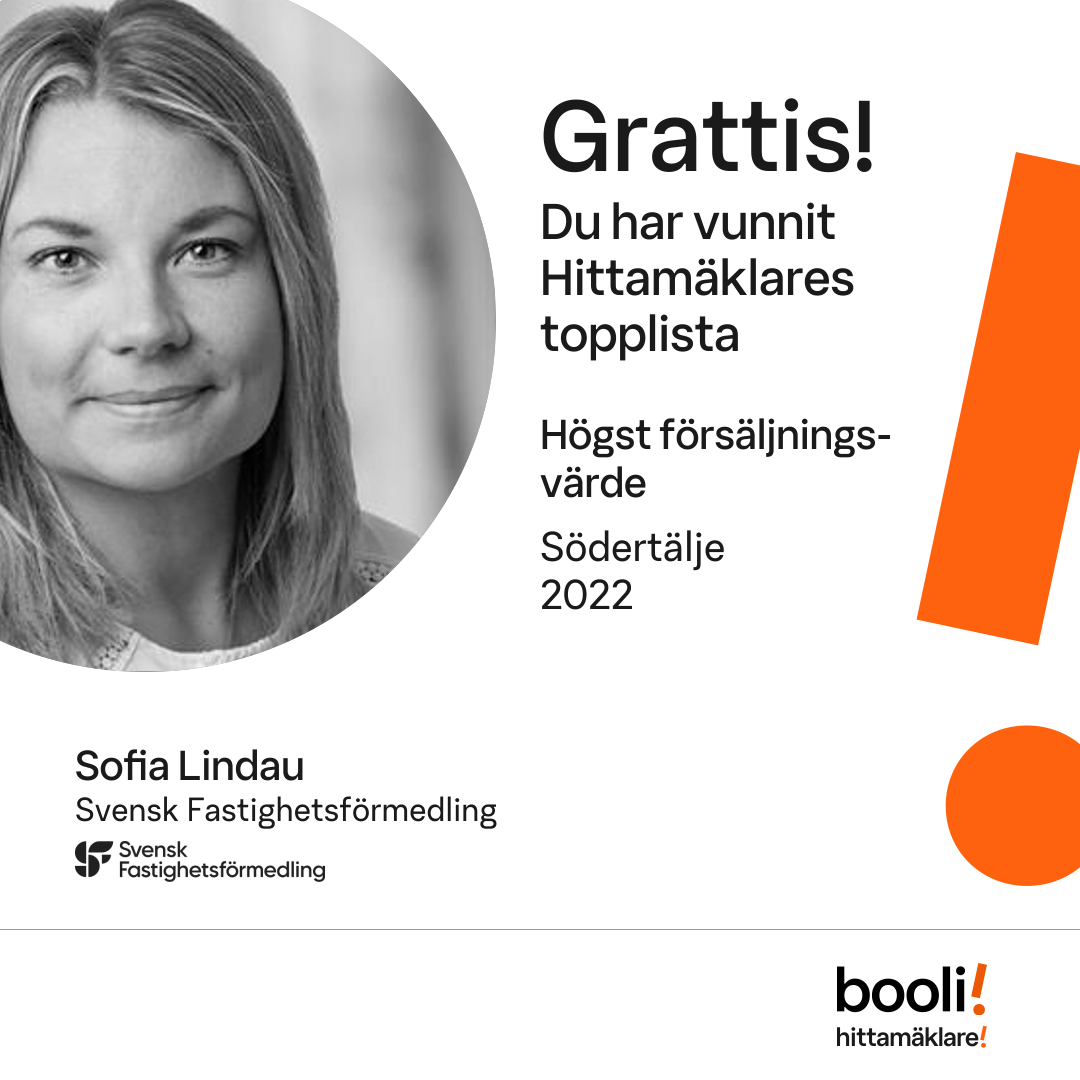Statistik för publicerade bostäder, försäljningar och omdömen baseras på data från Booli och Hittamäklare. Statistiken för försäljningar avser inrapporterade och verifierade slutpriser från mäklare eller av Booli inhämtade och verifierade slutpriser. Statistiken för publicerade bostäder baseras på information som publicerats på Booli.se. Statistik för omdömen och rekommendationer baseras på omdömen från säljare som lämnats via Booli och Hittamäklare.
