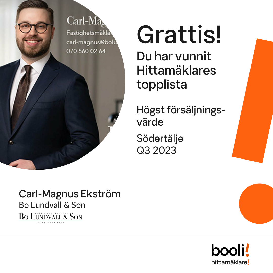 Statistik för publicerade bostäder, försäljningar och omdömen baseras på data från Booli och Hittamäklare. Statistiken för försäljningar avser inrapporterade och verifierade slutpriser från mäklare eller av Booli inhämtade och verifierade slutpriser. Statistiken för publicerade bostäder baseras på information som publicerats på Booli.se. Statistik för omdömen och rekommendationer baseras på omdömen från säljare som lämnats via Booli och Hittamäklare.