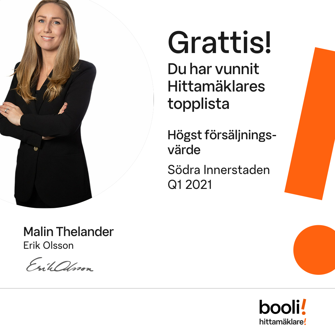 Statistik för publicerade bostäder, försäljningar och omdömen baseras på data från Booli och Hittamäklare. Statistiken för försäljningar avser inrapporterade och verifierade slutpriser från mäklare eller av Booli inhämtade och verifierade slutpriser. Statistiken för publicerade bostäder baseras på information som publicerats på Booli.se. Statistik för omdömen och rekommendationer baseras på omdömen från säljare som lämnats via Booli och Hittamäklare.