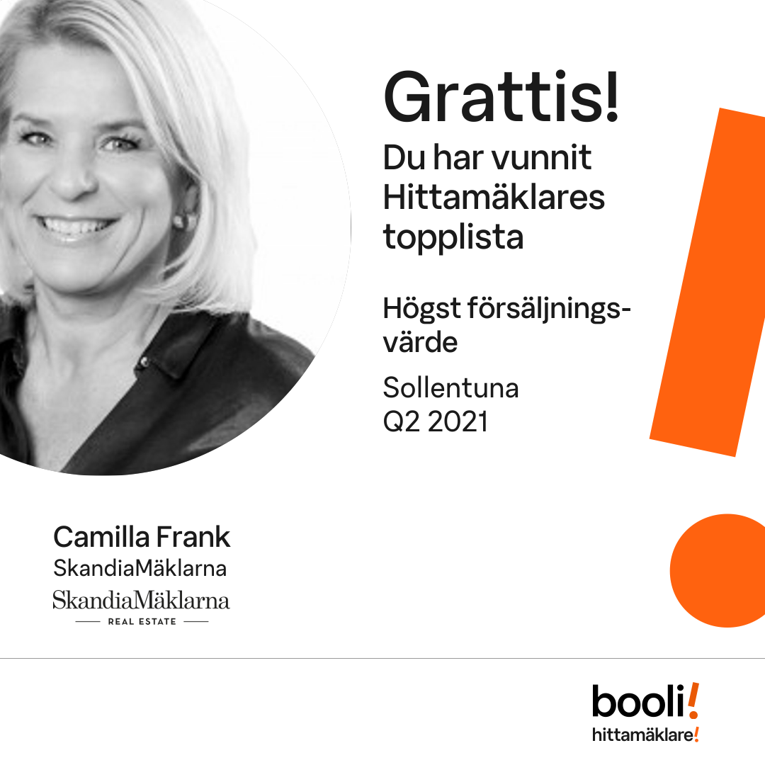 Statistik för publicerade bostäder, försäljningar och omdömen baseras på data från Booli och Hittamäklare. Statistiken för försäljningar avser inrapporterade och verifierade slutpriser från mäklare eller av Booli inhämtade och verifierade slutpriser. Statistiken för publicerade bostäder baseras på information som publicerats på Booli.se. Statistik för omdömen och rekommendationer baseras på omdömen från säljare som lämnats via Booli och Hittamäklare.