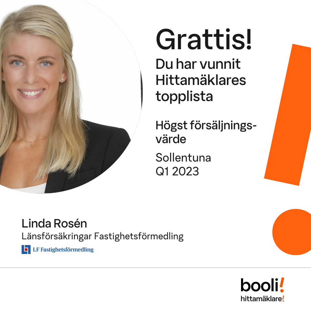 Statistik för publicerade bostäder, försäljningar och omdömen baseras på data från Booli och Hittamäklare. Statistiken för försäljningar avser inrapporterade och verifierade slutpriser från mäklare eller av Booli inhämtade och verifierade slutpriser. Statistiken för publicerade bostäder baseras på information som publicerats på Booli.se. Statistik för omdömen och rekommendationer baseras på omdömen från säljare som lämnats via Booli och Hittamäklare.