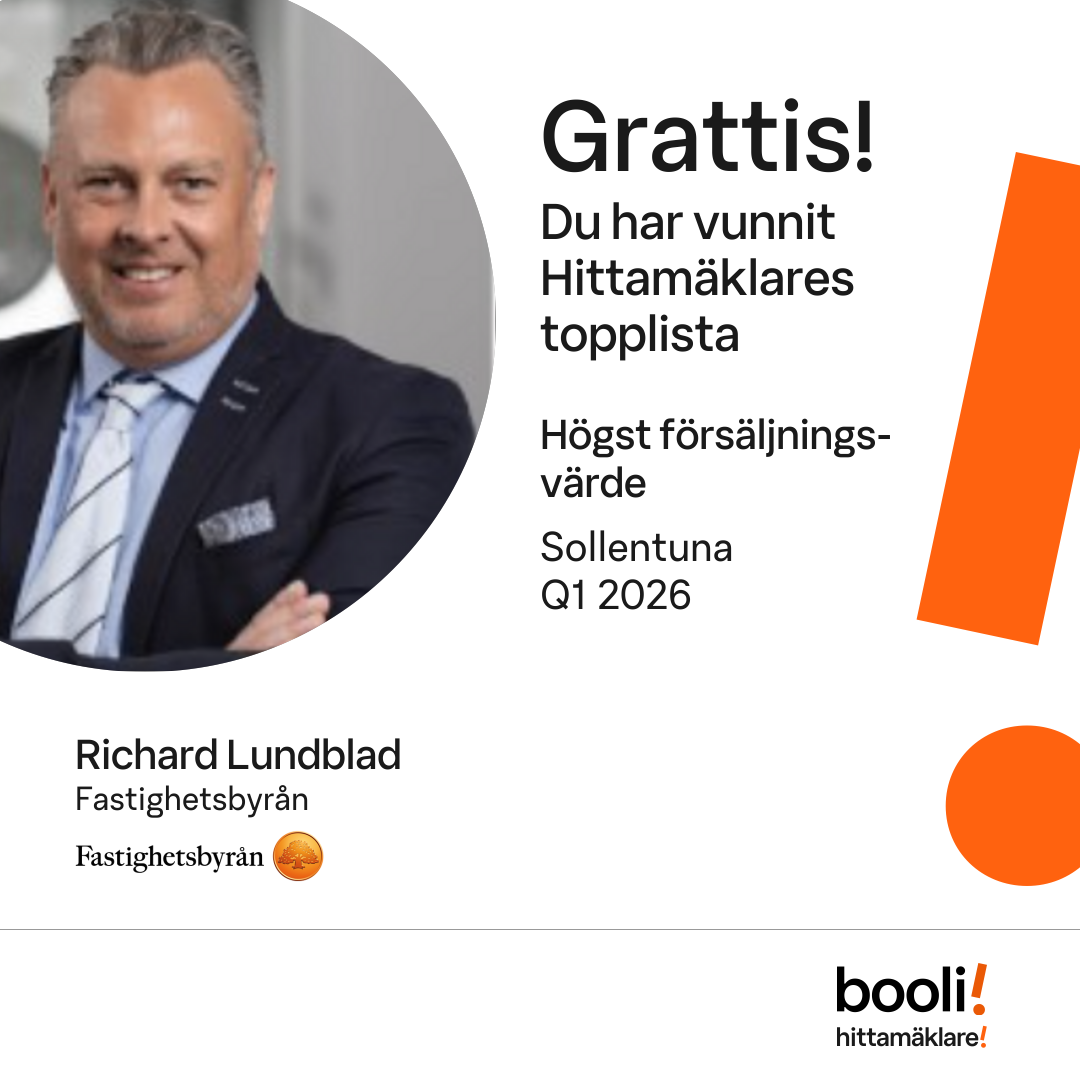 Statistik för publicerade bostäder, försäljningar och omdömen baseras på data från Booli. Statistiken för försäljningar avser inrapporterade och verifierade slutpriser från mäklare eller av Booli inhämtade och verifierade slutpriser. Statistiken för publicerade bostäder baseras på information som publicerats på Booli.se. Statistik för omdömen och rekommendationer baseras på omdömen från säljare som lämnats via Booli.