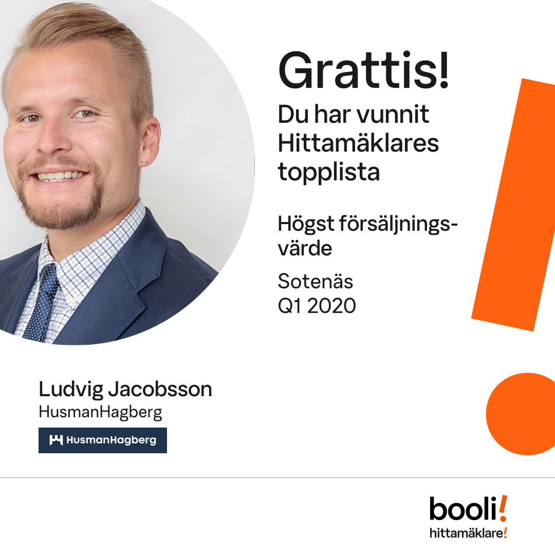 Statistik för publicerade bostäder, försäljningar och omdömen baseras på data från Booli och Hittamäklare. Statistiken för försäljningar avser inrapporterade och verifierade slutpriser från mäklare eller av Booli inhämtade och verifierade slutpriser. Statistiken för publicerade bostäder baseras på information som publicerats på Booli.se. Statistik för omdömen och rekommendationer baseras på omdömen från säljare som lämnats via Booli och Hittamäklare.