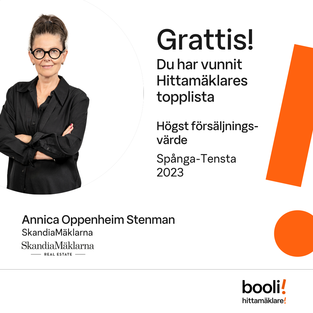 Statistik för publicerade bostäder, försäljningar och omdömen baseras på data från Booli och Hittamäklare. Statistiken för försäljningar avser inrapporterade och verifierade slutpriser från mäklare eller av Booli inhämtade och verifierade slutpriser. Statistiken för publicerade bostäder baseras på information som publicerats på Booli.se. Statistik för omdömen och rekommendationer baseras på omdömen från säljare som lämnats via Booli och Hittamäklare.