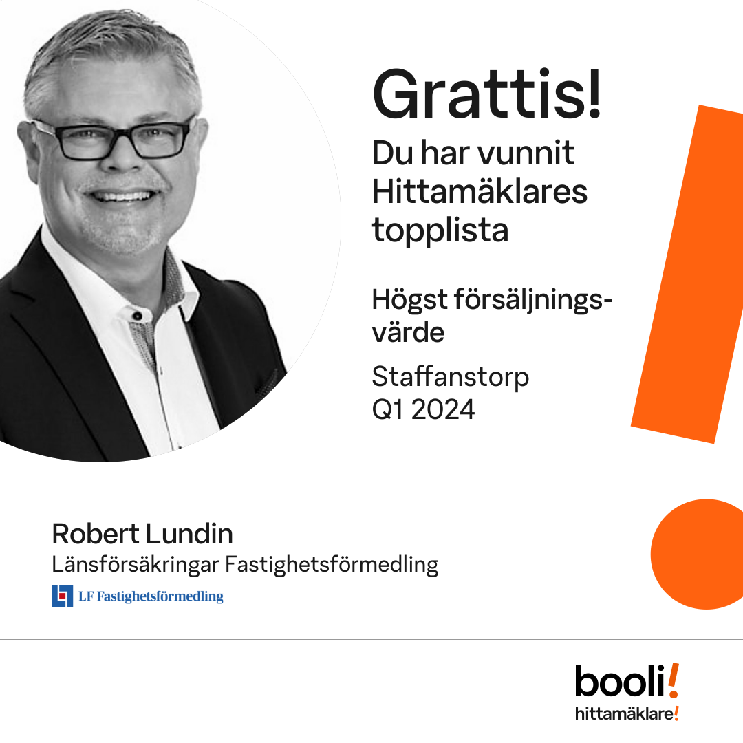 Statistik för publicerade bostäder, försäljningar och omdömen baseras på data från Booli och Hittamäklare. Statistiken för försäljningar avser inrapporterade och verifierade slutpriser från mäklare eller av Booli inhämtade och verifierade slutpriser. Statistiken för publicerade bostäder baseras på information som publicerats på Booli.se. Statistik för omdömen och rekommendationer baseras på omdömen från säljare som lämnats via Booli och Hittamäklare.