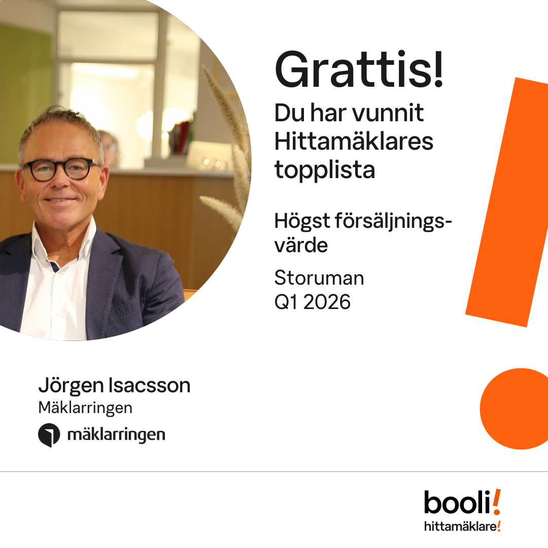 Statistik för publicerade bostäder, försäljningar och omdömen baseras på data från Booli. Statistiken för försäljningar avser inrapporterade och verifierade slutpriser från mäklare eller av Booli inhämtade och verifierade slutpriser. Statistiken för publicerade bostäder baseras på information som publicerats på Booli.se. Statistik för omdömen och rekommendationer baseras på omdömen från säljare som lämnats via Booli.