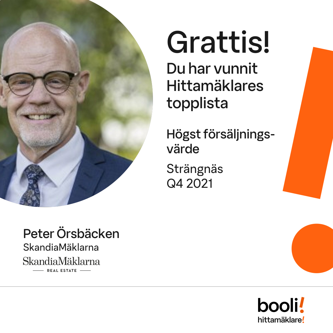 Statistik för publicerade bostäder, försäljningar och omdömen baseras på data från Booli och Hittamäklare. Statistiken för försäljningar avser inrapporterade och verifierade slutpriser från mäklare eller av Booli inhämtade och verifierade slutpriser. Statistiken för publicerade bostäder baseras på information som publicerats på Booli.se. Statistik för omdömen och rekommendationer baseras på omdömen från säljare som lämnats via Booli och Hittamäklare.