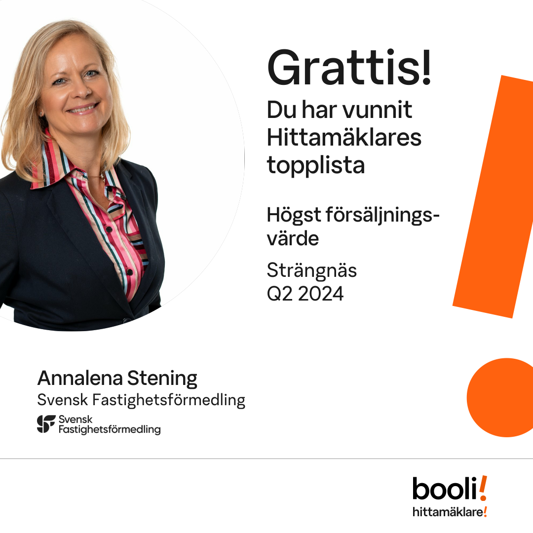 Statistik för publicerade bostäder, försäljningar och omdömen baseras på data från Booli och Hittamäklare. Statistiken för försäljningar avser inrapporterade och verifierade slutpriser från mäklare eller av Booli inhämtade och verifierade slutpriser. Statistiken för publicerade bostäder baseras på information som publicerats på Booli.se. Statistik för omdömen och rekommendationer baseras på omdömen från säljare som lämnats via Booli och Hittamäklare.