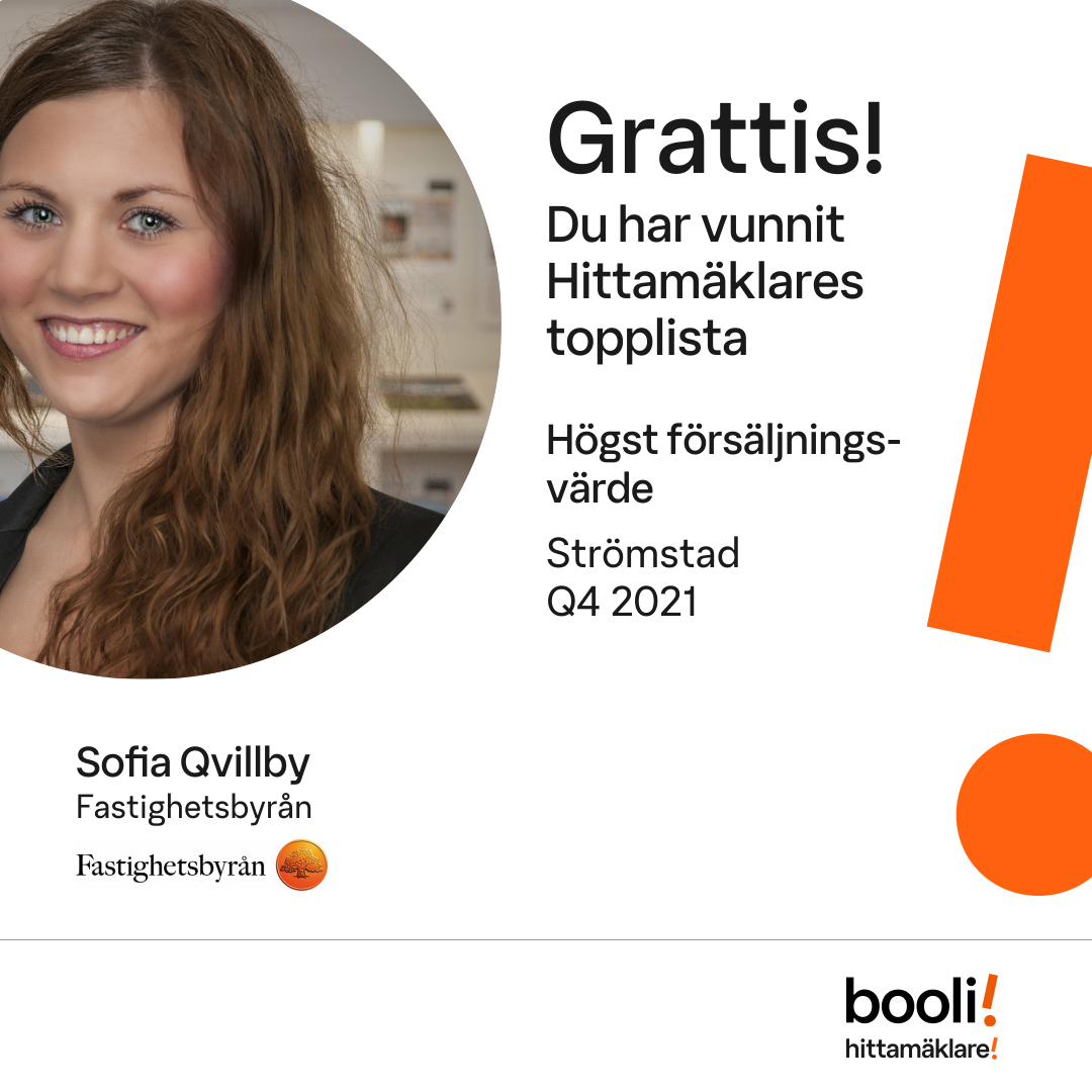 Statistik för publicerade bostäder, försäljningar och omdömen baseras på data från Booli och Hittamäklare. Statistiken för försäljningar avser inrapporterade och verifierade slutpriser från mäklare eller av Booli inhämtade och verifierade slutpriser. Statistiken för publicerade bostäder baseras på information som publicerats på Booli.se. Statistik för omdömen och rekommendationer baseras på omdömen från säljare som lämnats via Booli och Hittamäklare.