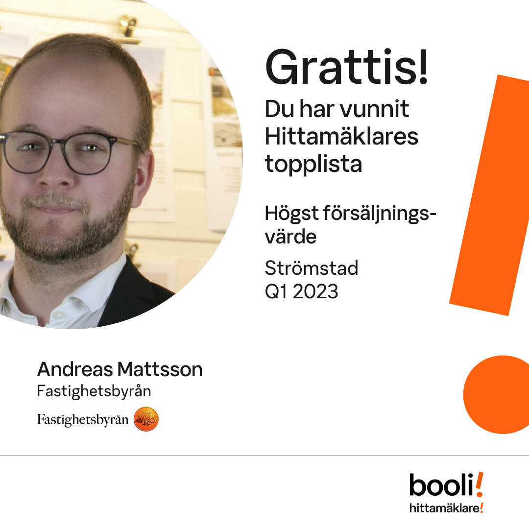 Statistik för publicerade bostäder, försäljningar och omdömen baseras på data från Booli och Hittamäklare. Statistiken för försäljningar avser inrapporterade och verifierade slutpriser från mäklare eller av Booli inhämtade och verifierade slutpriser. Statistiken för publicerade bostäder baseras på information som publicerats på Booli.se. Statistik för omdömen och rekommendationer baseras på omdömen från säljare som lämnats via Booli och Hittamäklare.