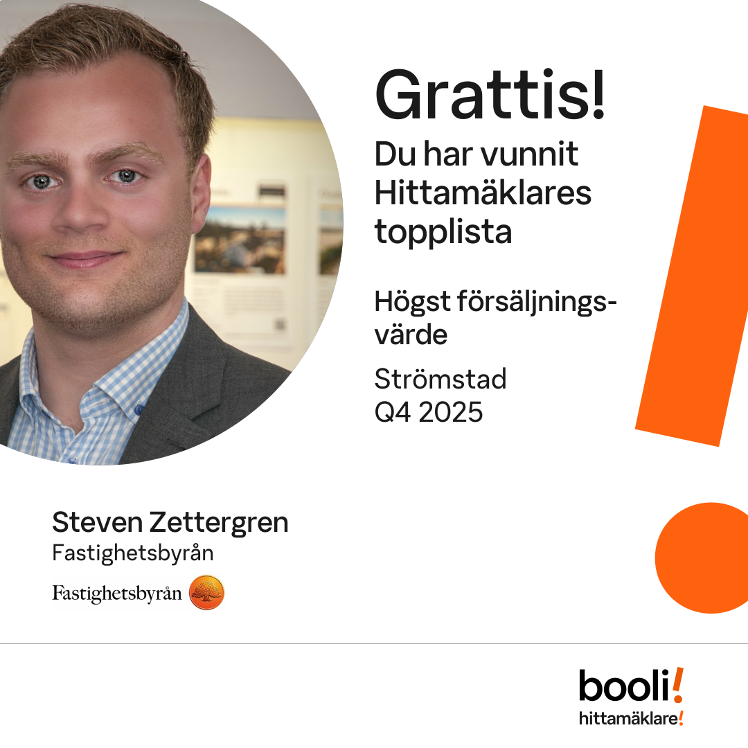 Statistik för publicerade bostäder, försäljningar och omdömen baseras på data från Booli och Hittamäklare. Statistiken för försäljningar avser inrapporterade och verifierade slutpriser från mäklare eller av Booli inhämtade och verifierade slutpriser. Statistiken för publicerade bostäder baseras på information som publicerats på Booli.se. Statistik för omdömen och rekommendationer baseras på omdömen från säljare som lämnats via Booli och Hittamäklare.