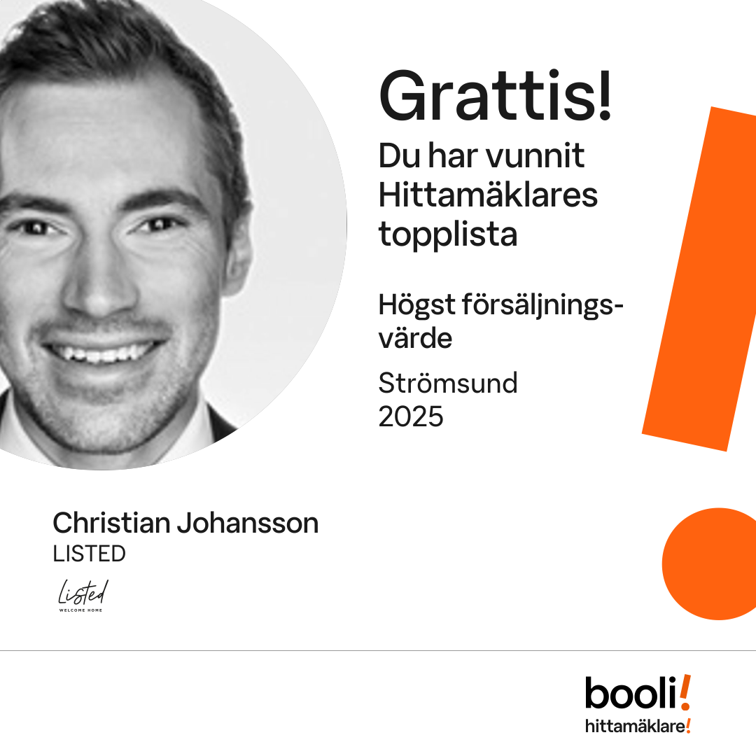 Statistik för publicerade bostäder, försäljningar och omdömen baseras på data från Booli och Hittamäklare. Statistiken för försäljningar avser inrapporterade och verifierade slutpriser från mäklare eller av Booli inhämtade och verifierade slutpriser. Statistiken för publicerade bostäder baseras på information som publicerats på Booli.se. Statistik för omdömen och rekommendationer baseras på omdömen från säljare som lämnats via Booli och Hittamäklare.